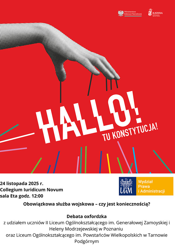 Stowarzyszenie Sędziów Polskich IUSTITIA Oddział Wielkopolski w Poznaniu we współpracy z Wydziałem Prawa i Administracji UAM w Poznaniu zapraszają na debatę oksfordzką, która odbędzie się w dniu 24 listopada br. o godz. 12.00 w sali Eta w Collegium Iuridicum Novum.