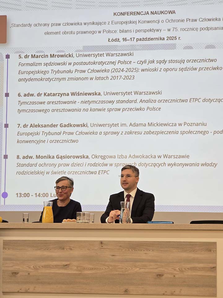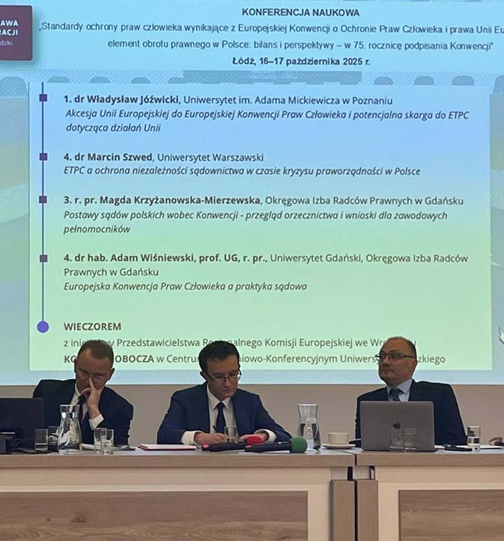 W dniach 16 – 17 października 2025 r. na Wydziale Prawa i Administracji Uniwersytetu Łódzkiego odbyła się ogólnopolska konferencja naukowa pt. „Standardy ochrony praw człowieka wynikające z Europejskiej Konwencji o Ochronie Praw Człowieka i prawa Unii Europejskiej jako element obrotu prawnego w Polsce: bilans i perspektywy – w 75. rocznicę podpisania Konwencji”. Na zaproszenie organizatorów w konferencji uczestniczyli: dr Aleksander Gadkowski z Zakładu Prawa Międzynarodowego i Organizacji Międzynarodowych i dr Władysław Jóźwicki z Zakładu Prawa Konstytucyjnego. W pierwszym dniu konferencji dr Władysław Jóźwicki wygłosił referat pt. „Akcesja Unii Europejskiej do Europejskiej Konwencji Praw Człowieka i potencjalna skarga do ETPC dotycząca działań Unii”, a w kolejnym dniu dr Aleksander Gadkowski zaprezentował referat pt. „Europejski Trybunał Praw Człowieka a sprawy z zakresu zabezpieczenia społecznego – podstawy konwencyjne i orzecznictwo”. Oba wystąpienia spotkały się z dużym zainteresowaniem i wywołały interesującą dyskusję. Organizatorami konferencji był Wydział Prawa i Administracji Uniwersytetu Łódzkiego oraz Okręgowa Izba Radców Prawnych w Gdańsku, a podmiotami ją współorganizującymi były: Okręgowa Izba Radców Prawnych w Łodzi, Okręgowa Izba Radców Prawnych we Wrocławiu, Okręgowa Izba Radców Prawnych w Rzeszowie, Przedstawicielstwo Regionalne Komisji Europejskiej we Wrocławiu oraz Izba Adwokacka w Warszawie. Patronem medialnym tego wydarzenia został serwis informacyjny „Prawo.pl”. Organizatorzy zapowiedzieli publikację referatów w Europejskim Przeglądzie Sądowym.