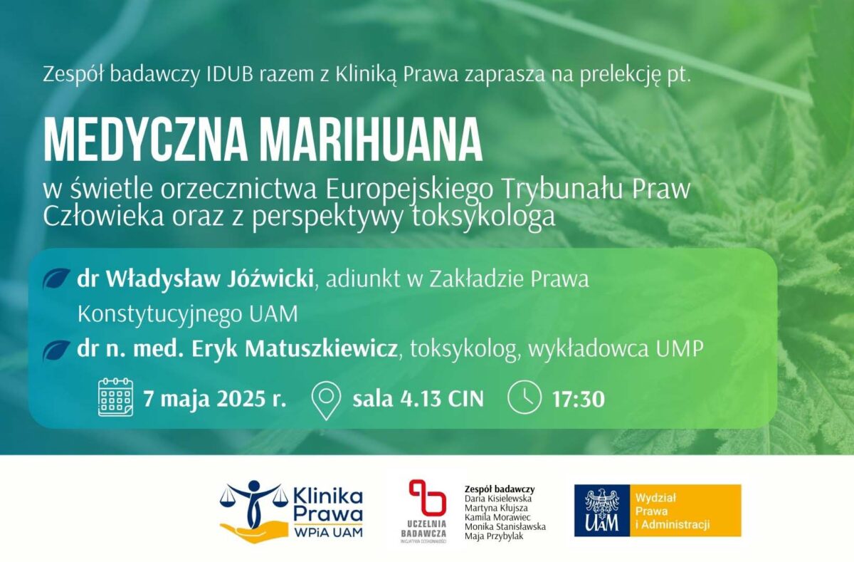 Grupa badawcza realizująca projekt w ramach programu IDUB study@research, serdecznie zaprasza na prelekcję pt. „Medyczna marihuana w świetle orzecznictwa Europejskiego Trybunału Praw Człowieka oraz z perspektywy toksykologa”, organizowaną pod patronatem Kliniki Prawa WPiA UAM. Prelegentami będą toksykolog dr n. med. Eryk Matuszkiewicz oraz dr Władysław Jóźwicki.