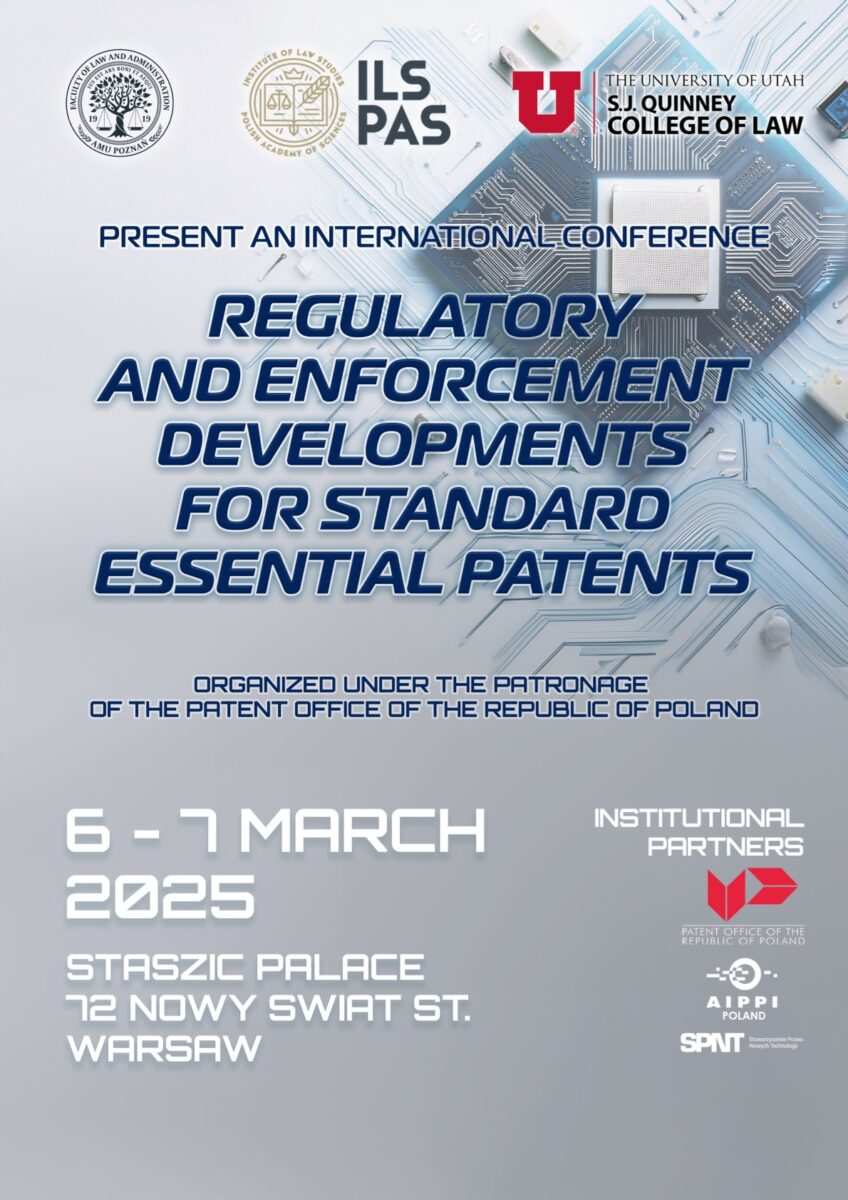 Zakład Prawa Europejskiego Wydziału Prawa i Administracji UAM, Instytut Nauk Prawnych Polskiej Akademii Nauk oraz University of Utah S.J. Quinney College of Law zapraszają na międzynarodową konferencję pt. „Regulatory and Enforcement Developments for Standard Essential Patents”, organizowaną pod patronatem Urzędu Patentowego Rzeczypospolitej Polskiej.