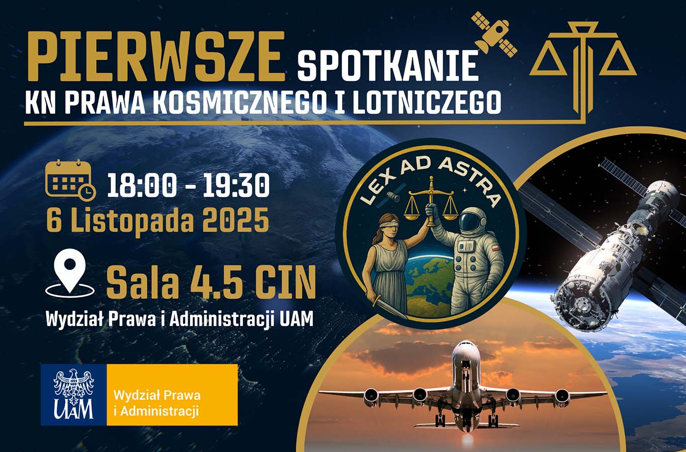 Koło Naukowe Prawa Kosmicznego i Lotniczego „Lex Ad Astra” wraz z Zakładem Prawa Międzynarodowego i Organizacji Międzynarodowych serdecznie zapraszają na pierwsze spotkanie Koła.