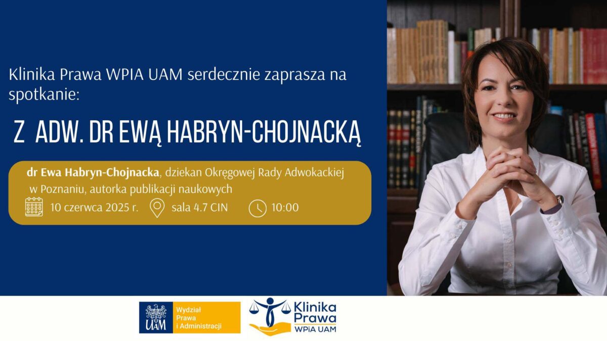 Klinika Prawa działająca przy Wydziale Prawa i Administracji Uniwersytetu im. Adama Mickiewicza w Poznaniu zaprasza na inspirujące spotkanie z adw. dr Ewą Habryn-Chojnacką, które odbędzie się w dniu 10 czerwca br. o godzinie 10:00 w sali 4.7 CIN.