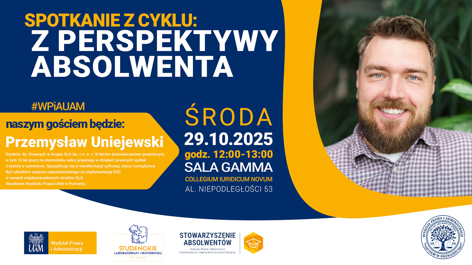 Studenckie Laboratorium Mentoringu (SLM) zaprasza studentów na cykliczne spotkania z ekspertami, którzy podzielą się swoimi doświadczeniami związanymi z kreowaniem własnej kariery prawniczej. Naszym kolejnym gościem będzie Przemysław Uniejewski, absolwent Wydziału Prawa i Administracji UAM w Poznaniu, dyrektor ds. Prawnych w Grupie OLX Sp. z o. o. z 15-letnim doświadczeniem prawniczym, w tym 10 lat pracy na stanowisku radcy prawnego w działach prawnych spółek z branży e-commerce. Specjalizuje się w transformacji cyfrowej, etyce i compliance. Był członkiem zespołu odpowiedzialnego za implementację ESG w ramach międzynarodowych struktur OLX.