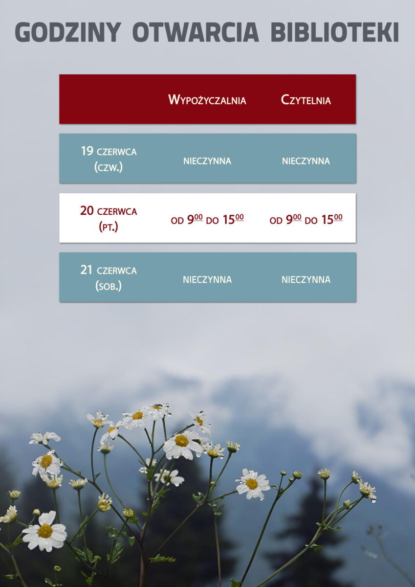 - 20 czerwca (piątek) – Biblioteka czynna w godzinach: