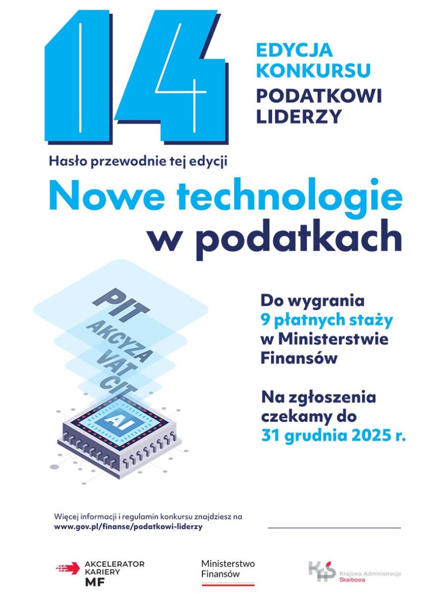 Rusza 14. edycja konkursu organizowanego przez Ministerstwo Finansów Podatkowi Liderzy pod hasłem przewodnim „Nowe technologie w podatkach”. To wyjątkowa szansa dla studentów i absolwentów, którzy chcą pokazać swoje pomysły i spojrzenie na sztuczną inteligencję i analizę danych w administracji podatkowej. Na zwycięzców czeka dziewięć płatnych staży w Ministerstwie Finansów. Zachęcamy do udziału w konkursie oraz udostępnienia informacji o tej inicjatywie na Państwa uczelni.