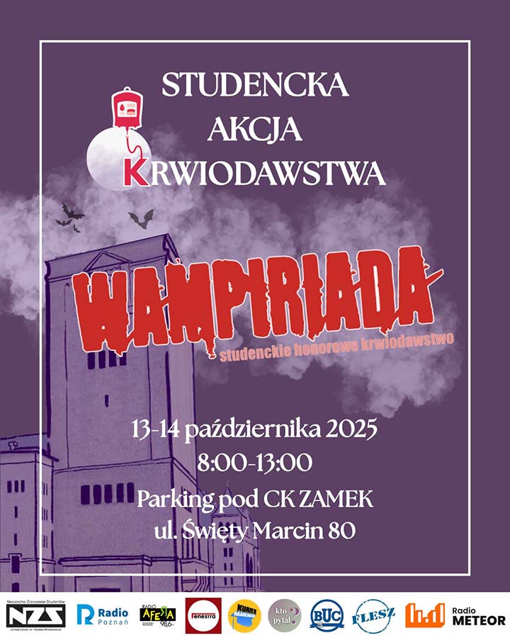 W dniach 13 – 14 października Niezależne Zrzeszenie Studentów UAM organizuje Wampiriadę – akcję charytatywną, której celem jest zbiórka krwi. Akcja ta odbywa się dwa razy w roku, a obecnie wypada jej 25-lecie. Podczas wydarzenia będą również przewidziane różne atrakcje związane z oddawaniem krwi.